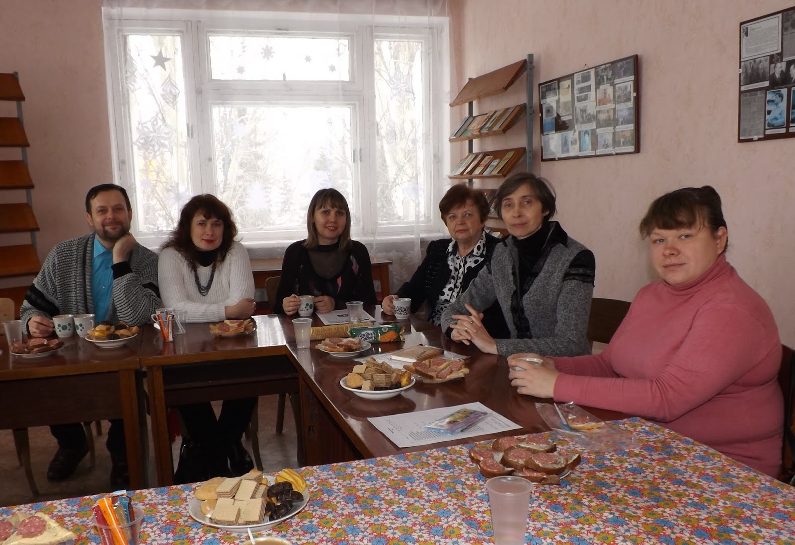 Рабочие будни за чайным столом в литературной гостинной Центральной библиотеки им. Т. Шевченко.На самом деле это была суббота, и к тому же, официальные вопросы были рассмотрены в течении 10 минут, после чего мы, благополучно налив чай да кофе, сели за круглый стол. Помимо членов Межрегионального союза писателей: Виктории Поляковой, Екатерины Ромащук, Оксаны Егорцевой, Любови Кутковой и меня, присутствовали наши друзья: Александр Савенков и Ольга Блюмина, Сергей Чернявский и Владимир Анпилогов и мои дочь и супруга, а также наша хозяйка Елена Пеева. Сперва мы почитали свои стихи, потом, когда за разговорами стали всплывать имена наших ушедших соратников, мы по кругу прочитали и их стихи: Сергея Фомина и Тамары Гончаровой, Олега Герасимова и Дмитрия Дятлова, Сергея Фесенко и Али Герасимович. Потом один кружок посвятили любимым авторам, прозвучали стихи Пастернака и Мануйлова, Есенина и Тряпкина. Одним словом, неофициальное собрание превратилось в прекрасный вечер поэзии. Расходились под закрытие библиотеки и, не торопясь расставаться, пошли по домам пешком, чтобы ещё пообщаться на ходу.